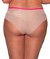 Ущільнені чашечки підшиті бавовною, підсилені бежевим поролоном, і знімними вкладками пуш-ап, щоб сексуально підкреслити округлість грудей. Зовнішній шар чашечки виконано з ніжного тюлю тілесного кольору, оздобленого яскравою квітчастою вишивкою, яка виходить за межі рожевих рамок чашок і піднімається на двоколірну лямочку. Елегантний пояс бюстгальтера і арка між чашками з сексуальним віконцем і золотистим логотипом AVA міцно тримають бюстгальтер на потрібному місці. Спинка застібається на три гачки з триступеневим регулюванням.