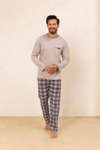 Бавовняна чоловіча піжама 488 Regina, бежевий — з довгим рукавом, класичний фасон, в клітинку